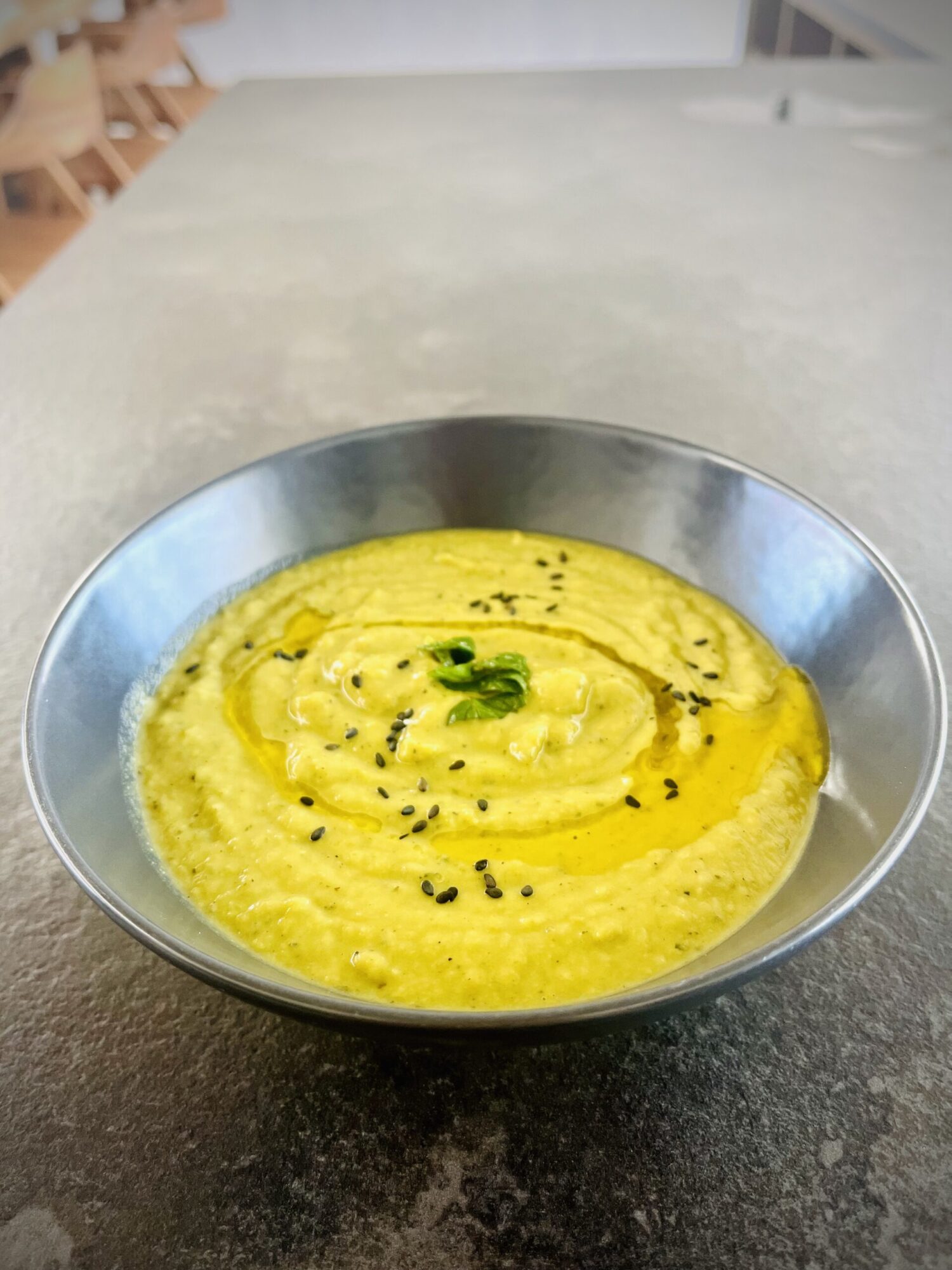 – Agregar los guisantes. Que siga la cocción unos 15′ más. Apagar el fuego. Agregar la menta y batir hasta obtener la textura deseada. Servir con una hojita de menta ( y si quieres alguna semilla, en la foto: sesamo negro tostado).