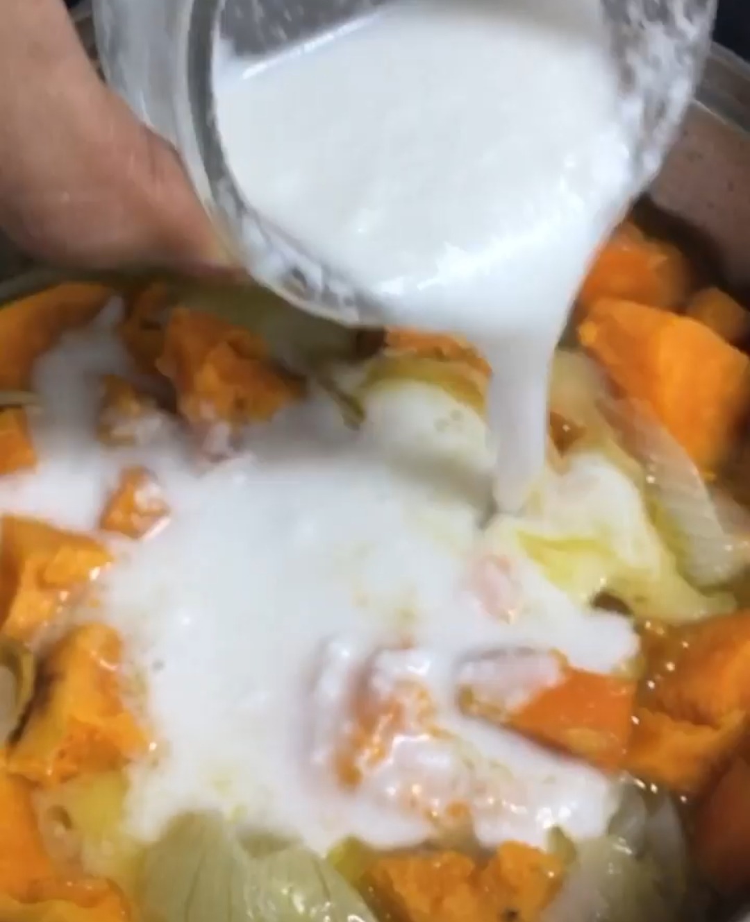 🥥 Agregar unos 100ml de leche de coco, ralladura de limón, chorrito de limón y chorrito de jugo de jengibre. Tapar y cocinar media hora más!! Batir y a comer!!! 🥥🧅🍠🥕🍋