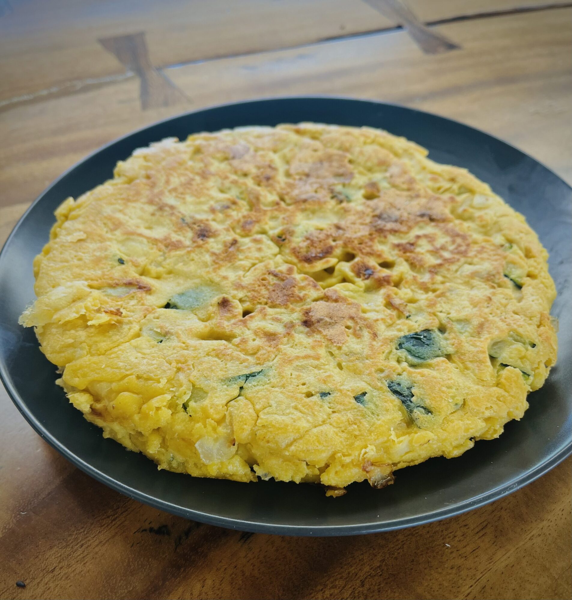Mezclar harina de garbanzo con agua, una pizca de sal y un chorrito de vinagre (para neutralizar el sabor de garbanzo). Ir removiendo y agregando agua poco a poco hasta obtener la textura del huevo. Sofreír la cebolla y luego agregar el calabacín, cuando esté todo cocido al gusto, agregar a la mezcla de la harina de garbanzo y de ahí un chorrito de aceite de oliva a una sartén caliente y cocinar vuelta y vuelta. Usar la tapa unos minutos para que se cocine por dentro.